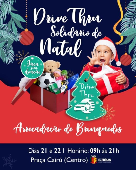 A Prefeitura de Ilhéus, por meio da Secretaria de Desenvolvimento Social (SDS), realizará nos dias 21 e 22 de dezembro o Drive-Thru Solidário de Natal. A ação acontece na Praça Cairu – Centro, das 9h às 21h, sem intervalo para almoço e tem o objetivo arrecadar brinquedos que serão entregues para crianças carentes do município.