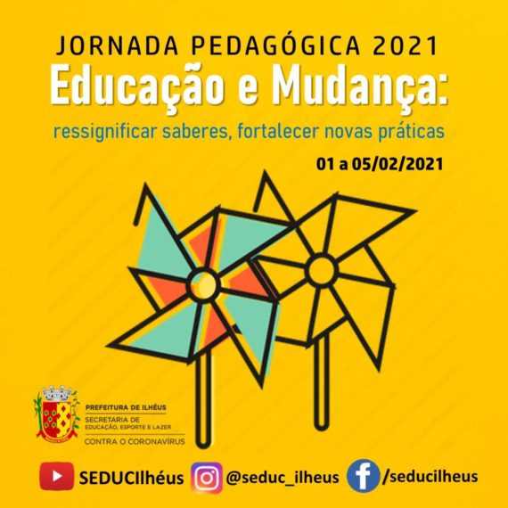 “Educação e Mudança: ressignificar saberes, fortalecer novas práticas” é o tema da Jornada Pedagógica 2021 (JP2021) que a secretaria de Educação, Esporte e Lazer (Seduc) da Prefeitura de Ilhéus vai realizar de 01 a 05 de fevereiro. 1.800 servidores, entre docentes da Educação Infantil, Ensino Fundamental I e II, Educação de Jovens e Adultos, gestores e não docentes participarão do evento, que acontece no meio virtual, no Youtube da Seduc Ilhéus. As inscrições estão abertas para todos os profissionais da educação municipal e interessados, que pode ser realizada por meio do link https://doity.com.br/jornada-pedagogica-2021 .