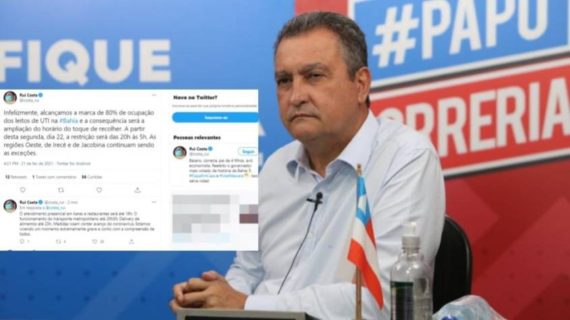 O anúncio de Rui foi feito por meio do Twitter. “Infelizmente, alcançamos a marca de 80% de ocupação dos leitos de UTI na #Bahia e a consequência será a ampliação do horário do toque de recolher. A partir desta segunda, dia 22, a restrição será das 20h às 5h. A região Oeste será a única exceção na atualização do decreto”, escreveu.