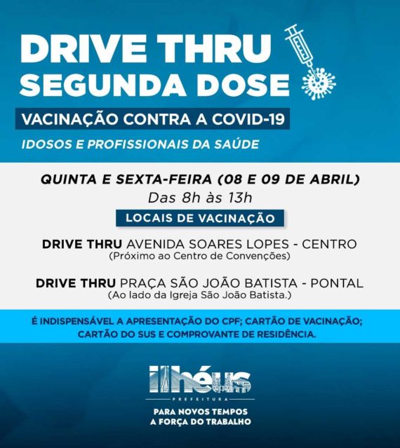 COVID-19: ILHÉUS MONTA PONTOS DE DRIVE-THRU PARA APLICAÇÃO DA 2ª DOSE NA QUINTA (08) E SEXTA (09)