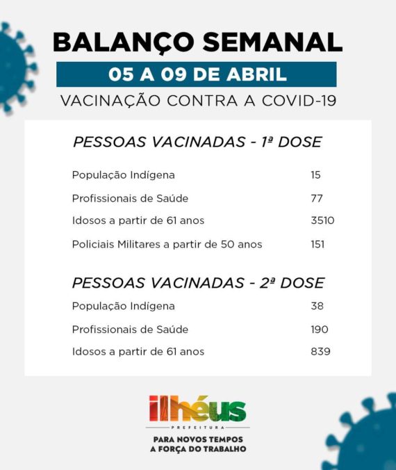 Um total de 4.820 foram vacinadas contra a Covid-19 em Ilhéus, na última semana, de 5 a 9 de abril de 2021, de acordo com a secretaria de Saúde (Sesau) da Prefeitura de Ilhéus. Desse total, 3.753 vacinas aplicadas da primeira dose e 1.067 da segunda dose.