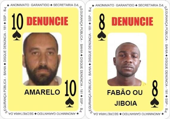 Já Fabio dos Santos Nascimento, o ‘Fabão’ ou ‘Jiboia’, foi inserido na carta ‘Oito de Espadas’ e também é indiciado por organização criminosa. De acordo com a denúncia do Ministério Público da Bahia, Fábio possui o controle do tráfico de drogas em Vila Canária, Castelo Branco e nas localidades Lavrador e Rua do Sossego, na região de Valéria.