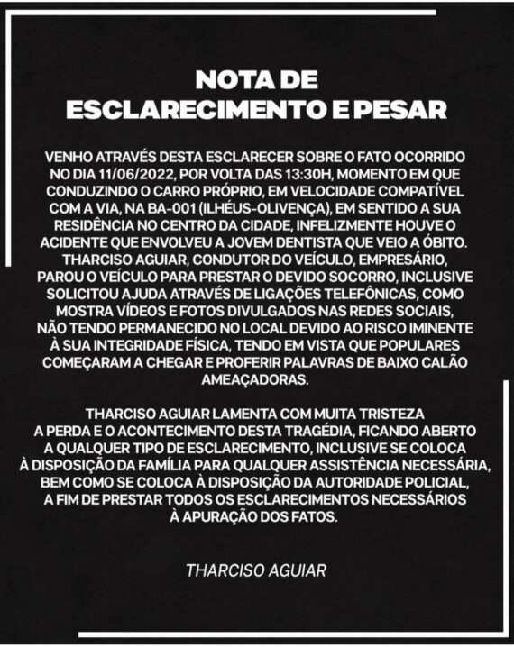 Em nota divulgada por Tharcisio, condutor do carro, ele diz também que parou o veículo e prestou a assistência a jovem, contudo, não permaneceu no local por ter sido ameaçado por populares.