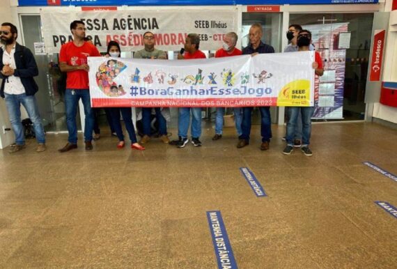 Na manhã desta terça-feira (26), representantes do Sindicato dos Bancários de Ilhéus protestaram contra assédio moral na agência 237 do Bradesco, localizada no Centro da cidade.