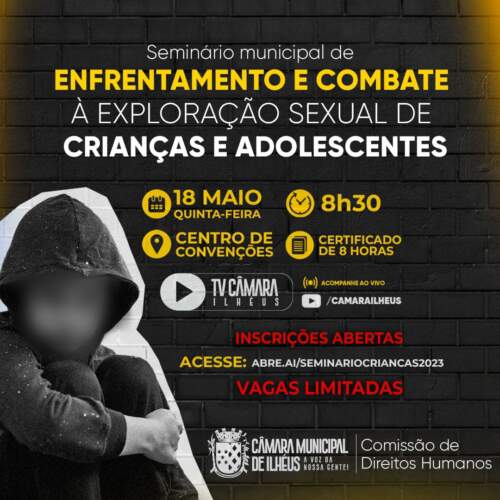 A Câmara de Vereadores de Ilhéus, através da Comissão de Direitos Humanos, abriu nesta semana as inscrições para o Seminário Municipal de Enfrentamento e Combate à Exploração Sexual de Crianças e Adolescentes que acontecerá no dia 18, a partir das 8h30, no Centro de Convenções. As vagas para o seminário são limitadas e os participantes terão direito a certificado com carga horária de 8 horas.