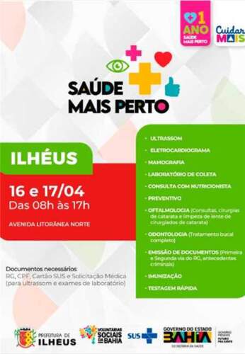 Nos dias 16 e 17 de abril, Ilhéus será palco da Feira ‘Saúde Mais Perto’. A feira é um projeto do Governo da Bahia promovido pela Secretaria de Saúde do Estado (SESAB) em parceria com as Voluntárias Sociais da Bahia e a Prefeitura de Ilhéus, por meio da Secretaria Municipal de Saúde e tem como objetivo, a regionalização da saúde levando atendimento de qualidade para todo o estado.