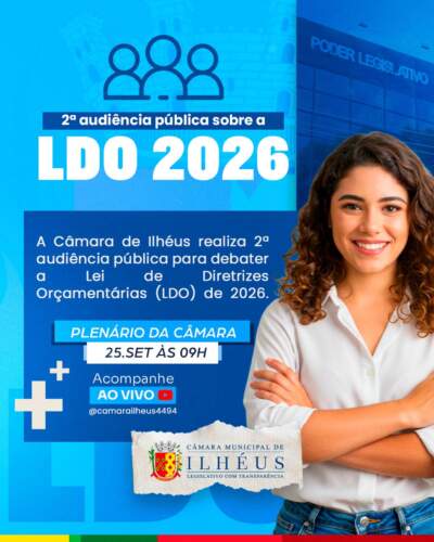 Na próxima quinta-feira (25), às 9h, ocorrerá no Plenário da Câmara Municipal de Ilhéus a segunda audiência pública sobre o Projeto de Lei nº 117/2025 (PLDO), que estabelece as diretrizes orçamentárias para a elaboração da Lei Orçamentária Anual (LOA) de 2026. A reunião é promovida pela Comissão de Finanças, Orçamento, Obras e Serviços Públicos do Legislativo municipal.
