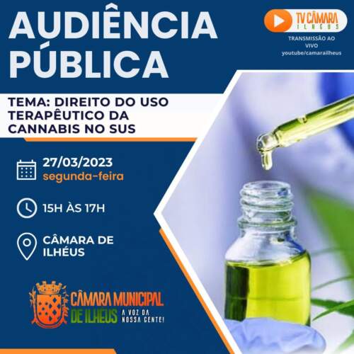 Nesta segunda-feira (27), a Câmara de ilhéus irá realizar uma audiência pública para discutir sobre o Direito do uso terapêutico da Cannabis no SUS e seus benefícios para a saúde e formas seguras de acesso. O debate foi proposto pelo vereador Vinicius Alcântara (Cidadania) e irá acontecer a partir das 15h, no plenário Gilberto Fialho.