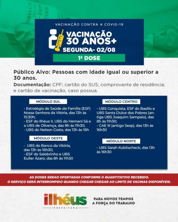 A Prefeitura de Ilhéus retoma na próxima segunda-feira (2) a aplicação da primeira dose contra a Covid-19 para pessoas com idade igual ou superior a 30 anos. De acordo com a Secretaria de Saúde (Sesau), a vacinação segue nas 13 unidades básicas de saúde informadas em comunicados anteriores, conforme horário de funcionamento das salas de imunização.