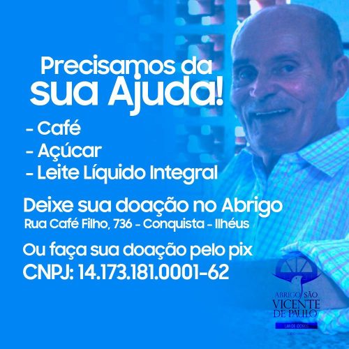 A Sociedade São Vicente de Paulo de Ilhéus lançou uma campanha de doação de itens para os 75 idosos abrigados na instituição. Itens como café, açúcar e leite líquido integral podem ser doados na sede do abrigo que fica no Alto da Conquista, Rua Café Filho, 736.