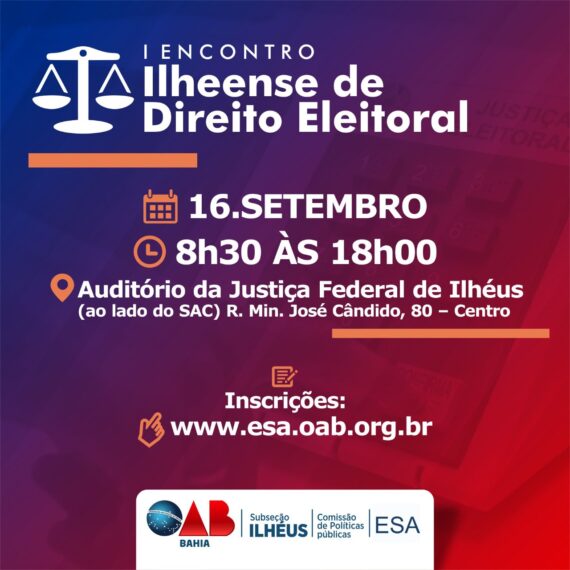 O evento é promovido pela OAB de Ilhéus, através da sua Comissão de Políticas Públicas. Serão abordados importantes temas afetos ao Direito Eleitoral, com palestrantes locais, regionais e nacionais.