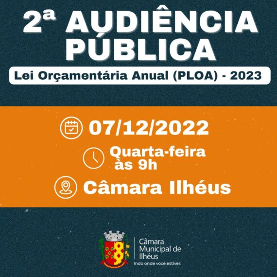 Cumprindo a legislação, a Câmara Municipal de Ilhéus, através da Comissão de Finanças, Orçamentos, Obras e Serviços Públicos, realizará na quarta-feira (07), a partir das 9h, a 2ª Audiência Pública do Projeto de Lei Orçamentária Anual (PLOA) 078/2022 para o exercício financeiro de 2023.