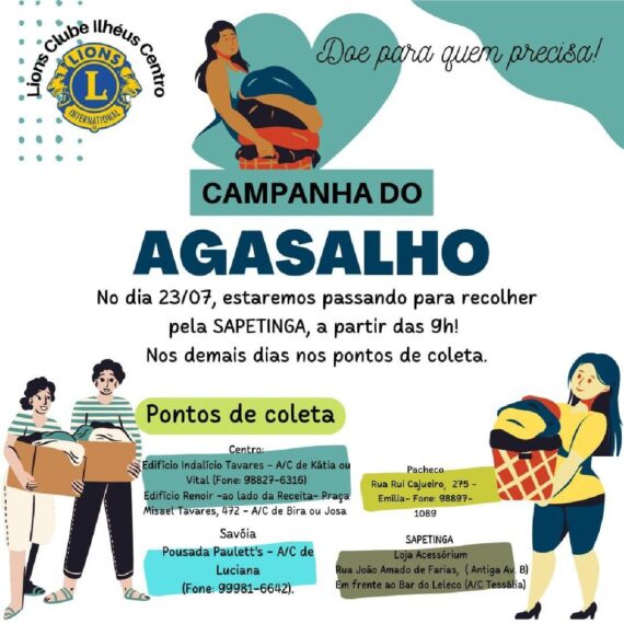 O Lions Club Ilhéus está promovendo mais uma campanha do agasalho. Em casa dia da semana o Club estará em um bairro da cidade para realizar a arrecadação de agasalhos e donativos.