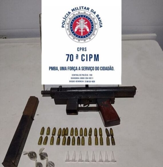 Uma Submetralhadora, pistola, munições e drogas foram localizados, neste sábado (18), por profissionais da 70ª Companhia Independente de Polícia Militar (Ilhéus). Casos aconteceram nos bairros Teotônio Vilela e Morada do Porto.