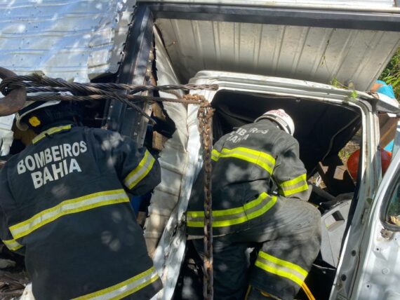Bombeiros militares do 5º GBM/Ilhéus resgataram um homem que ficou preso nas ferragens após um acidente veicular na BA 652 entre as cidades de Camamu e Travessão, nesta terça-feira (7). O caminhão baú tombou, desceu uma ribanceira e caiu próximo a um riacho e a carga do veículo ficou sobre o motorista o que dificultou o resgate.