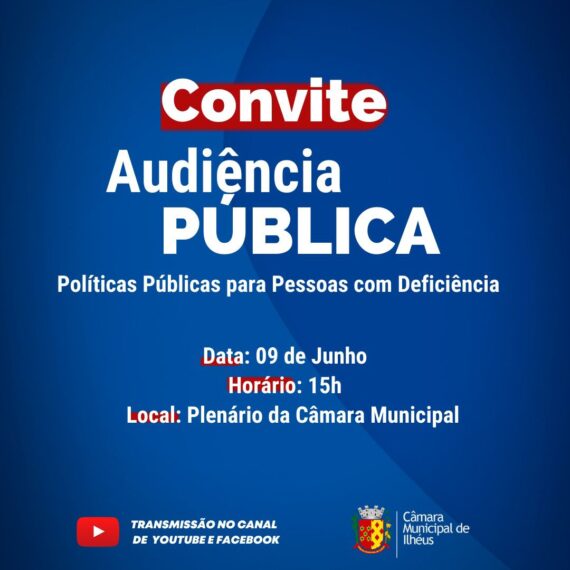 A audiência é aberta ao público e também será transmitida ao vivo através do canal do YouTube e Facebook da Câmara de Ilhéus.