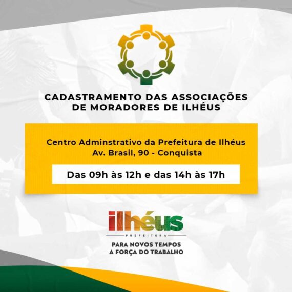 Representantes de associações de moradores, entidades e organizações não governamentais (ONGs) podem comparecer a partir desta segunda-feira (25) ao Centro Administrativo da Prefeitura de Ilhéus, no bairro Conquista, para realizar e atualizar seus respectivos cadastros. O serviço estará disponível de segunda a sexta-feira, das 9h às 12h e das 14h às 17h.