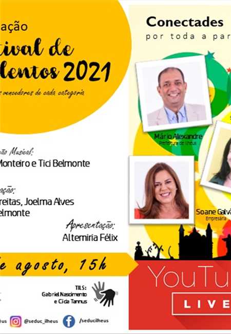 A Prefeitura de Ilhéus promove nesta sexta-feira, 13, a live de premiação do Festival de Talentos de 2021 da secretaria de Educação, no canal da Seduc no YouTube, às 16h. O encontro vai contar com os alunos vencedores das categorias música, dança, narrativas e audiovisuais, e as participações do prefeito Mário Alexandre, da secretária de Educação, Eliane Oliveira, e a convidada especial, Soane Galvão. Em sua segunda edição, o festival de 2021 foi realizado por meio de apresentações virtuais onde os alunos foram orientados a abordar a história e belezas de Ilhéus.