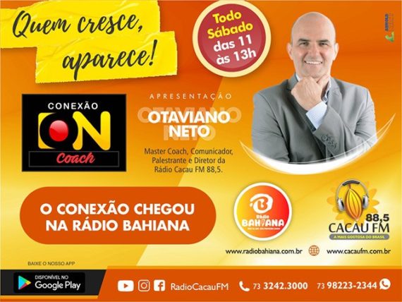 O programa Conexão ON Coach – líder de audiência nas manhãs de sábado na Cacau FM 88,5 – apresentado por Otaviano Neto (ON), com a participação do locutor Boninho Klayver – está dando um grande passo para se tornar sucesso de audiência no Sul e Extremo Sul da Bahia.