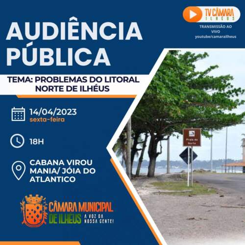 A câmara de Ilhéus realizará nesta sexta-feira (14), a partir das 18h, uma audiência pública para discutir sobre os problemas do litoral norte do município.