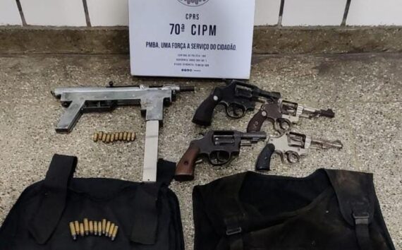 Dois adolescentes e um comparsa foram flagrados por guarnições da 70ª Companhia Independente da Polícia Militar (CIPM), na noite desta terça-feira (18), no município de Ilhéus, com uma submetralhadora e quatro revólveres.